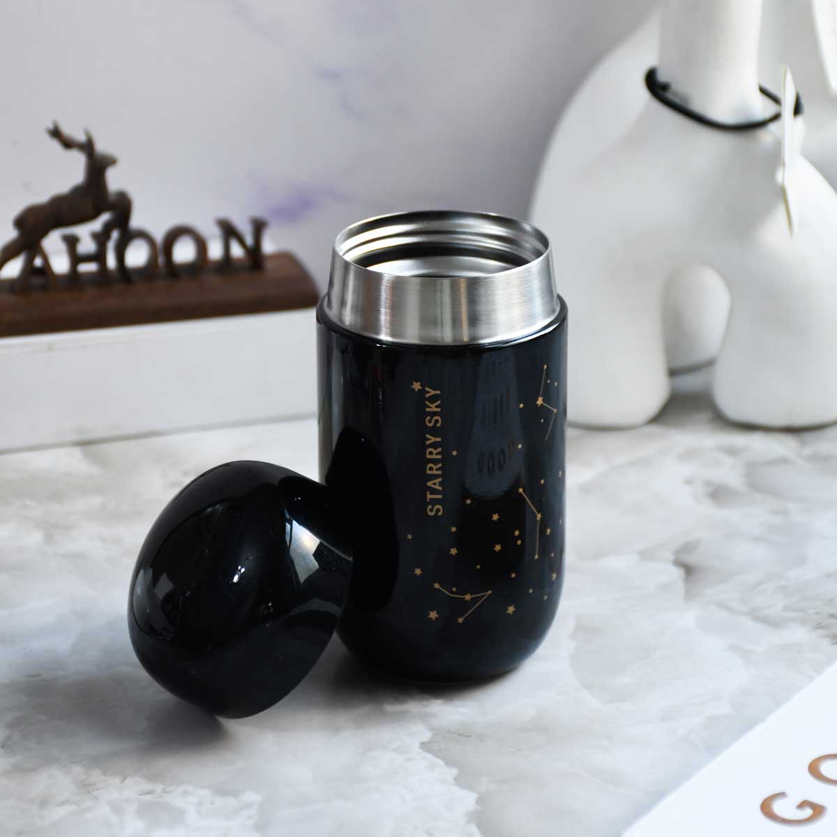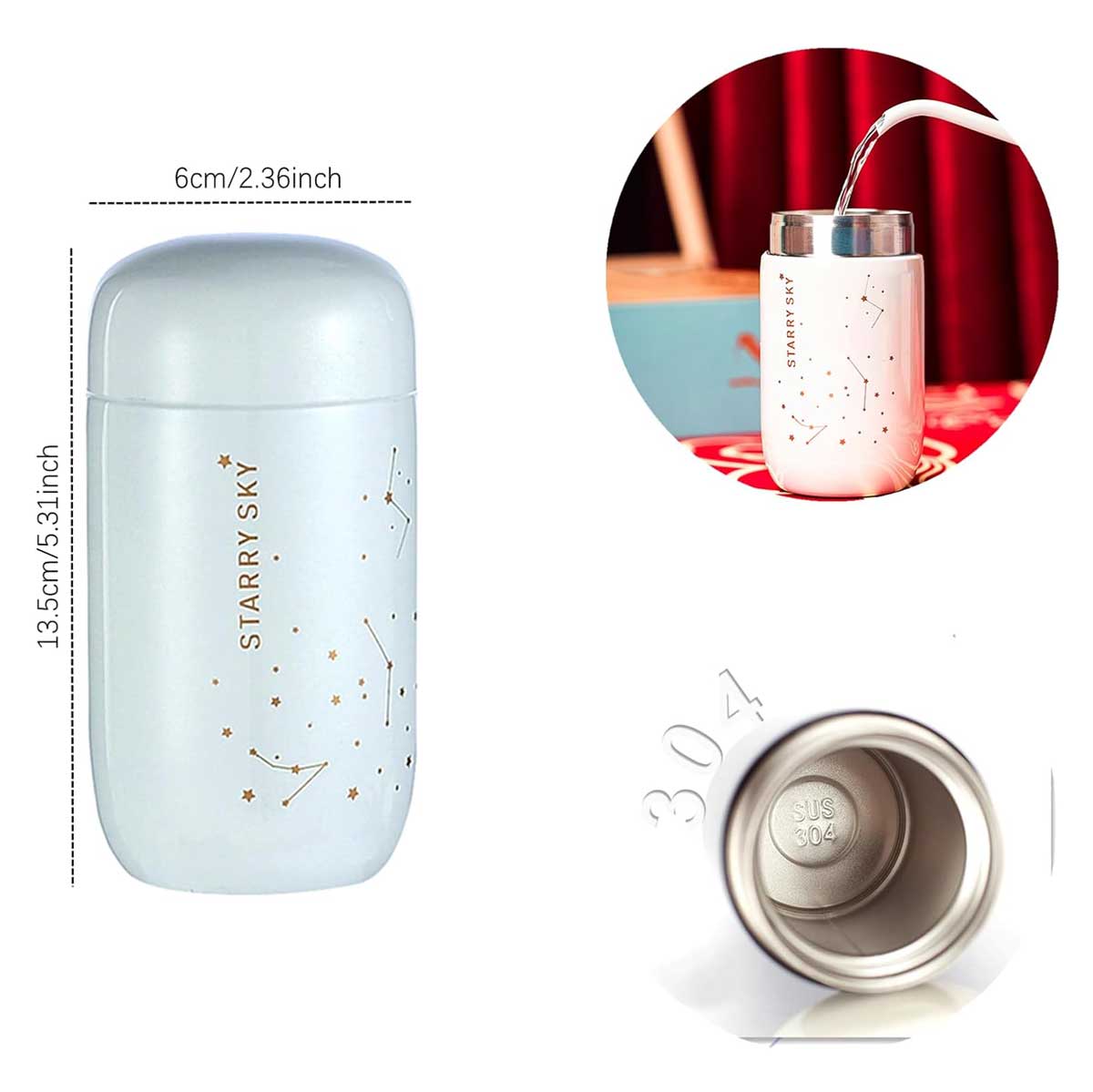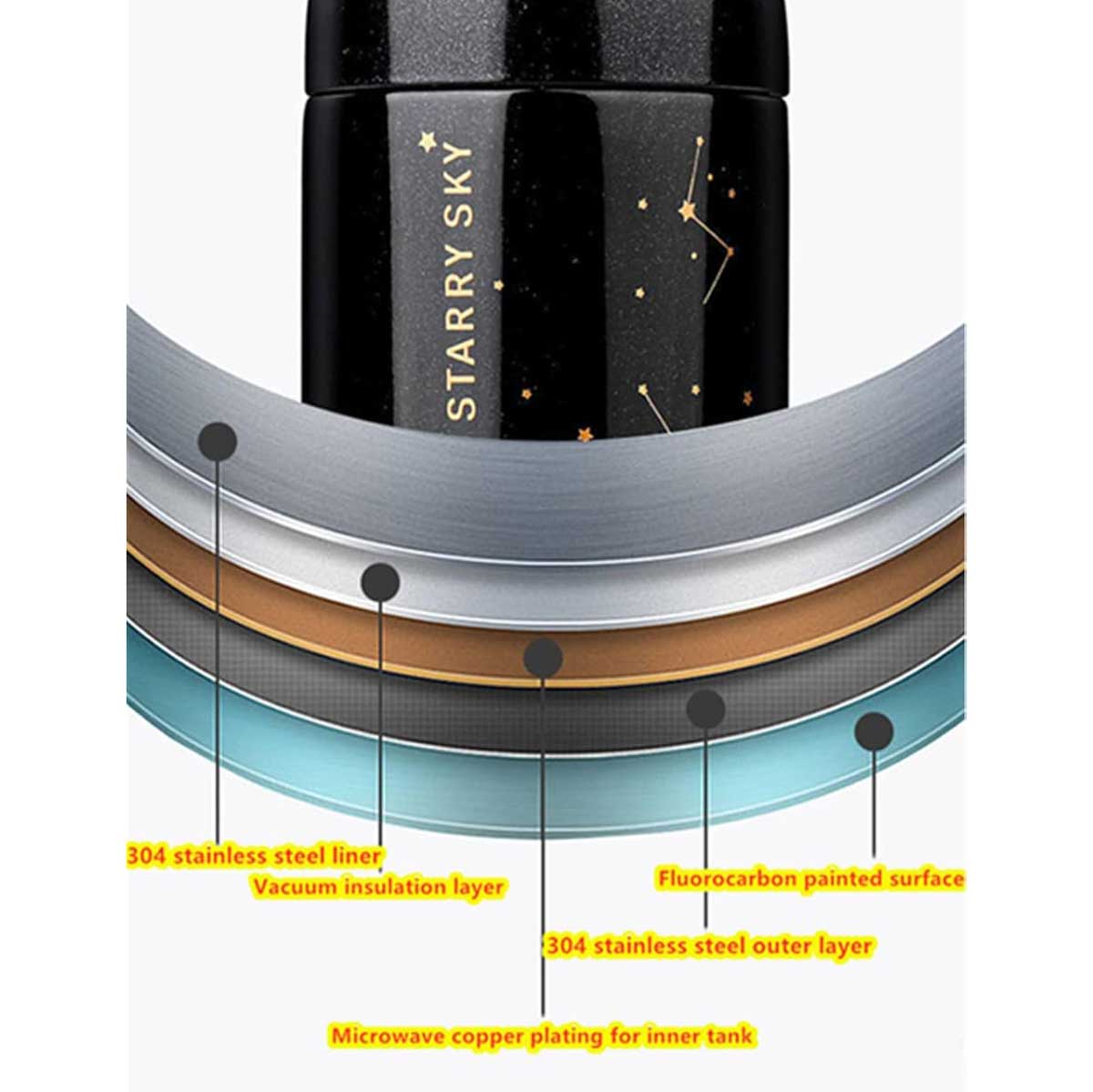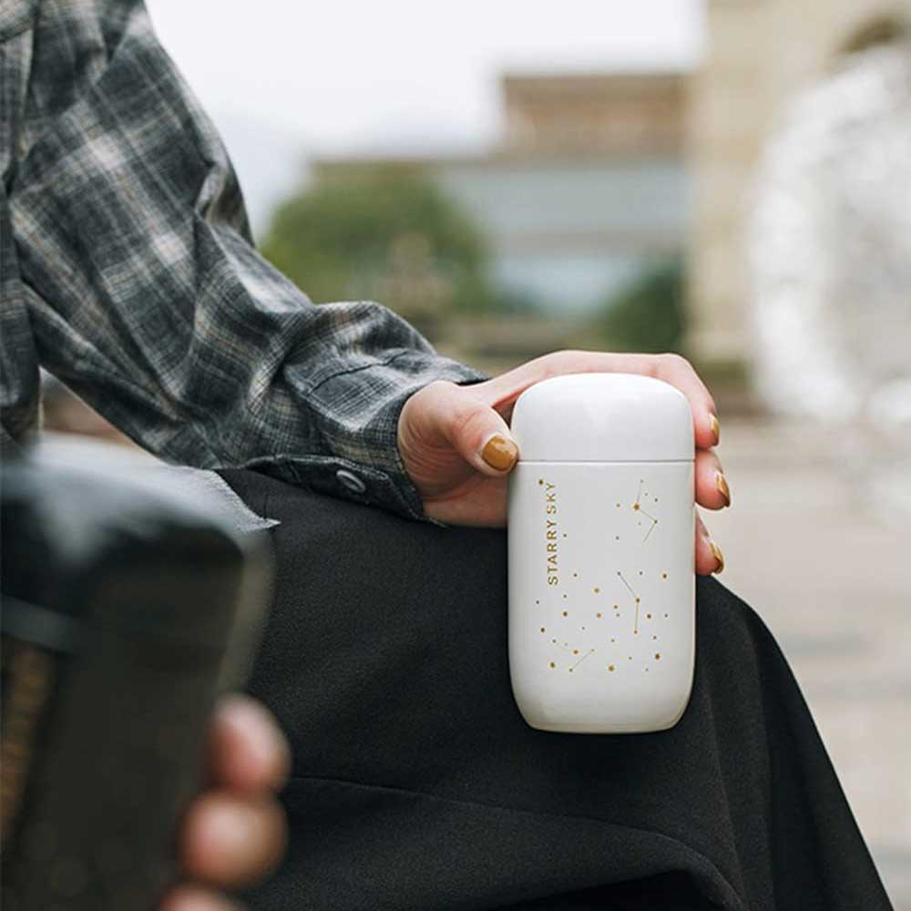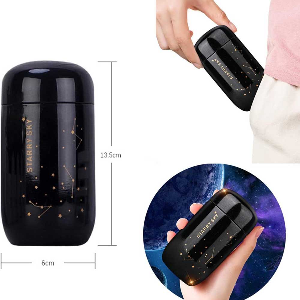 یکی از جذابترین تراول ماگ‌ها با یک طراخی مینیمال و جذاب که روی آن نقش ستاره‌ها و صور فلکی دارد. این تراول ماگ دارای ارتفاع 13.5 و قطر 6 سانتی متر است. جنس این تراول ماگ از استل 304 است و با توجه به داشتن چند لایه در حدی دمای مایع درون خود را حفظ کند.