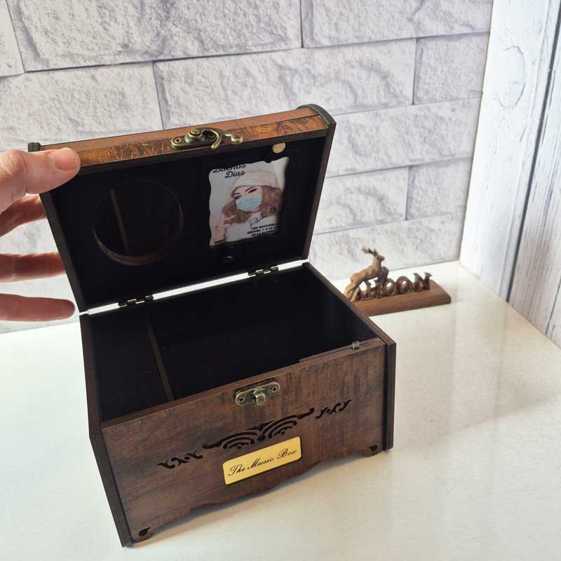 یک صندوق موزیکال چوبی که میتواند جای جواهرات و بدلیجات و لوازم آرایش باشد. این صندوق داخل خود علاوه بر جای جواهرات یک آینه و یک جای عکس دارد. این محصول موزیکال است و وقتی کوک شده باشد با باز شدن درب آن صدای موزیکال پخش می شود.