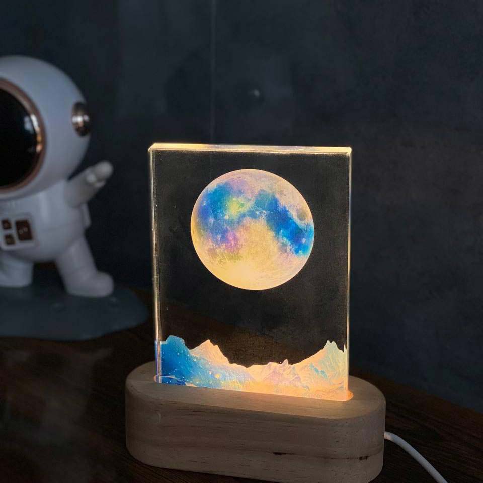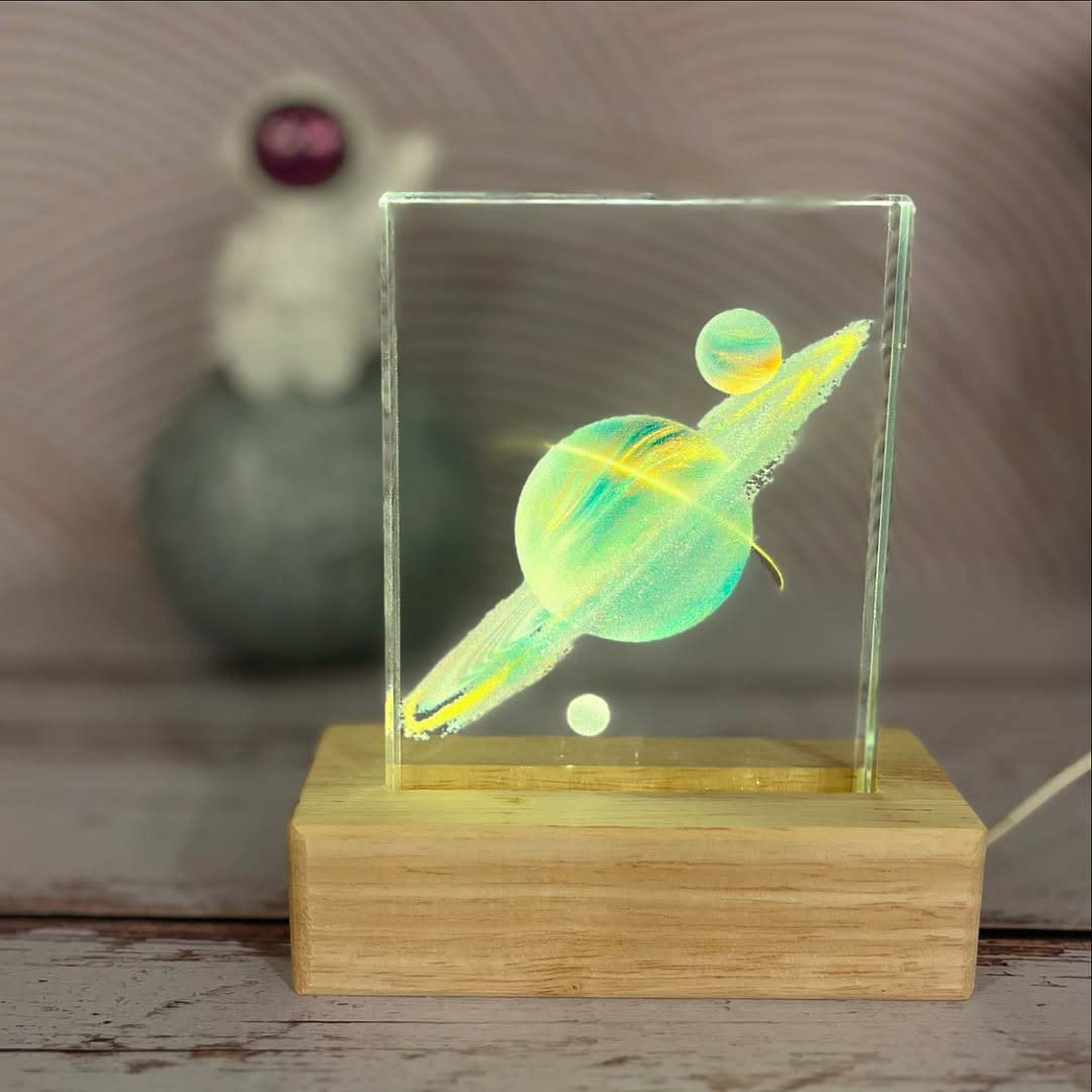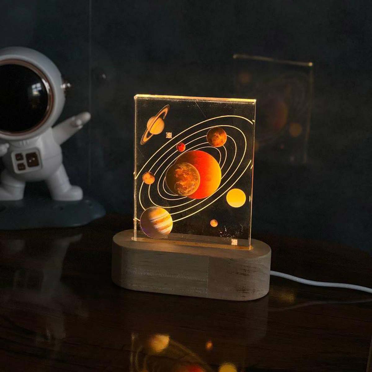 یک چراغ خواب خاص با طرح‌های فضایی جذاب که به شیشه کریستالی چسبیده اند. درون پایه چوبی ال ای دی هایی قرار دارد که در تاریکی جلوه زیبا به این چراغ خواب زیبا می دهد. طرح های فضایی مثل منظومه شمسی، ماه و سیارات است.