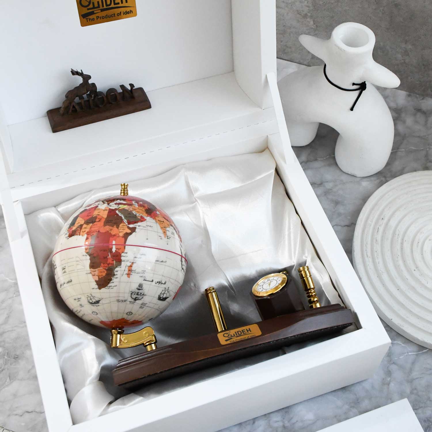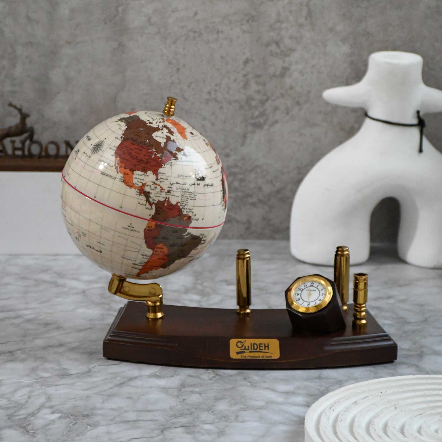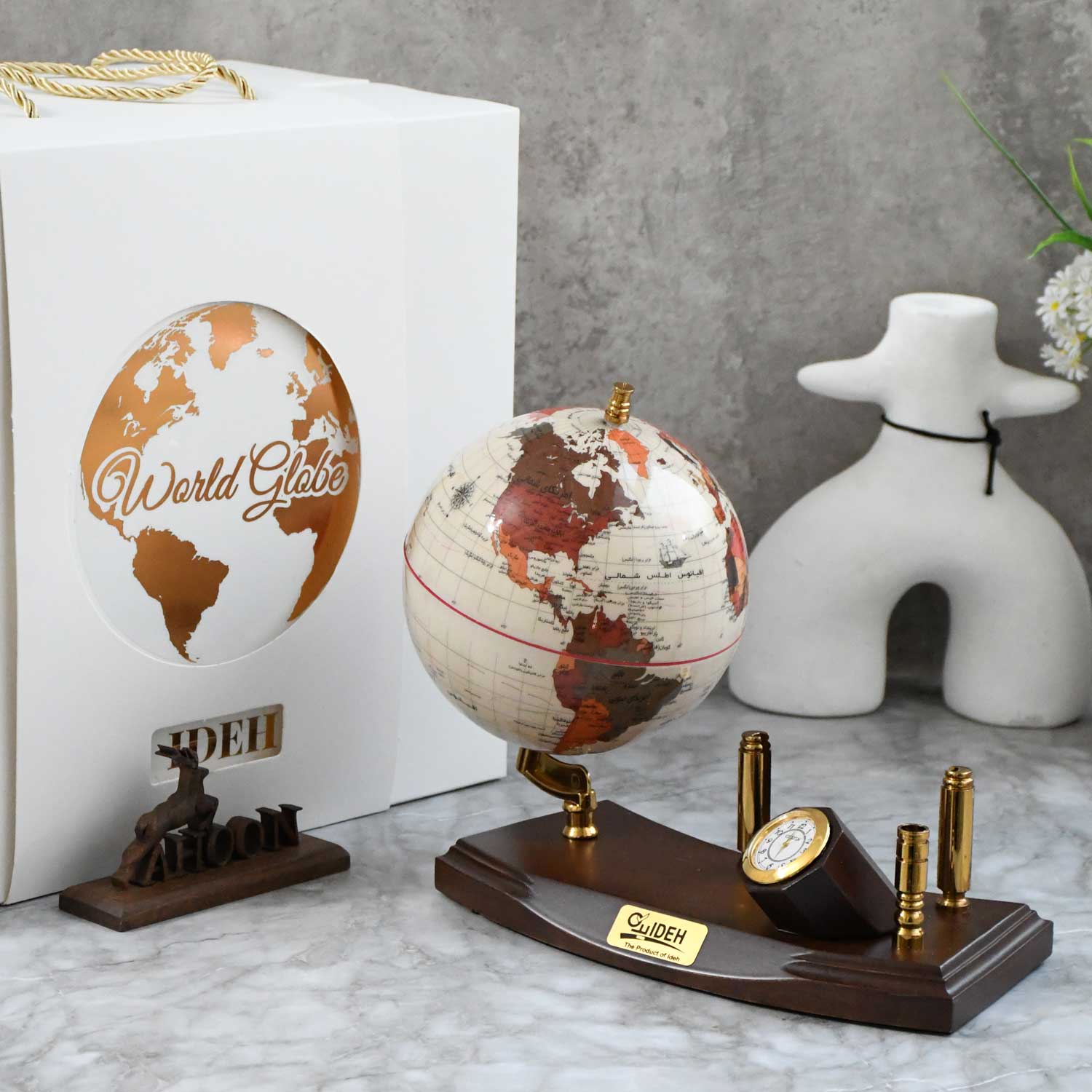 کره جغرافیایی قطر 14 سانتی متر با بایه چوبی مدل ساعتدار و جعبه مخصوص هدیه برند ایده